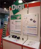 | 緑と白のツートンカラーのDigiブースでは、「ワイヤレスM2Mネットワーキング」をテーマに、さまざまなテクノロジーを展示・実演した。 |