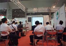ZigBeeパビリオン内でも講演を行い、来場者が熱心に聞き入る光景が見られた。 |