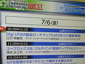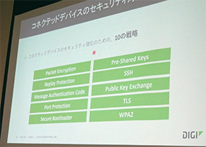 また、会期中は、IoTに関するセミナーも3セッションを実施、「Digi LPWA製品ロードマップとM2M/IoT最新事例」ならびに「IoTセキュリティの要件と実装 Digi TrustFenceによるIoTセキュリティ対策」、いずれも多くの方に聴講いただきました。とりわけ、システムレベルでのIoTセキュリティ要件を検討し、Digi TrustFenceによる実装例を紹介した後者のセッションは、座席数が足りないほどの大盛況となりました。