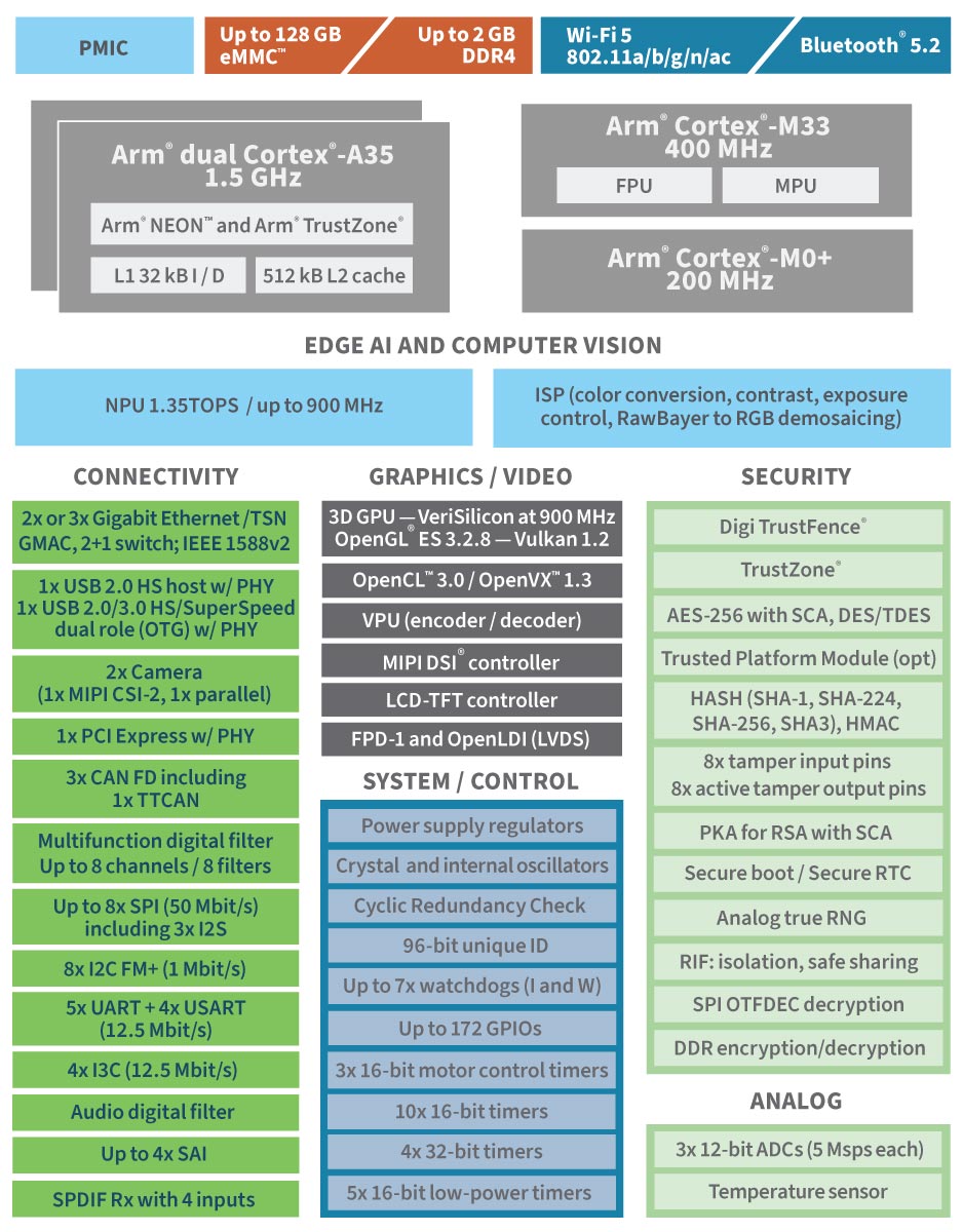 スケーラブルなDigi ConnectCore MP2モジュールファミリは、認証取得済みのデュアルバンドWi-Fi 6(トライバンド6E対応)802.11axおよびBluetooth® 5.4に加え、PCIe Gen2、USB 3.0、CAN-FD、TSN対応ギガビットイーサネットなど、幅広いワイヤレスコネクティビティオプションを提供します。さらに、3D GPU、ビデオエンコーダおよびデコーダ(VPU)、高解像度MIPI、LVDSまたはパラレルディスプレイインタフェース、ISP付きMIPIカメラポートなどのハイエンドグラフィックス機能を搭載しています。