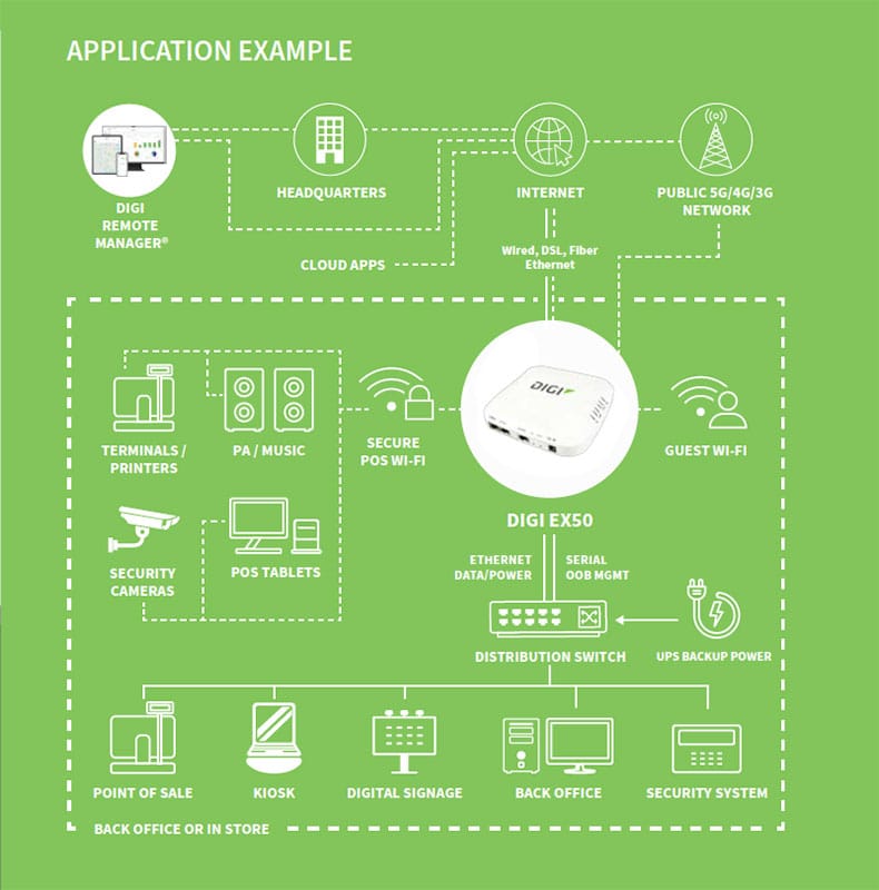 Digi EX50は、企業のメイン、ブランチ、マネージドホームオフィスに高速で信頼性の高いセキュアなプライマリやバックアップ接続を必要とする組織向けのオールインワン5Gセルラールータです。5Gセルラーを備えたDigi EX50は、将来性があり、費用対効果が高く、有線に代わる迅速な配備が可能なプライマリワイヤレスISPコネクティビティとなります。