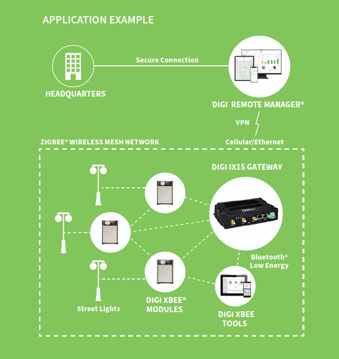 汎用性の高い「Digi IX15」デバイスは、ゲートウェイとルーターの両方の機能を備えており、ネットワーク運用のためのチップダウンのDIY設計に代わる低コストで迅速な市場投入を求めるカスタマに適しています。Digi IX15は、Digi XBee®モジュールをセルラーまたはイーサネット経由でクラウドアプリケーションに接続するインダストリアルグレードのIoTゲートウェイであり、ハードウェア、ソフトウェア、サービス、受賞歴のあるツールで構成されるDigi XBeeエコシステムに、インターネット接続への最も簡単なパスを提供します。