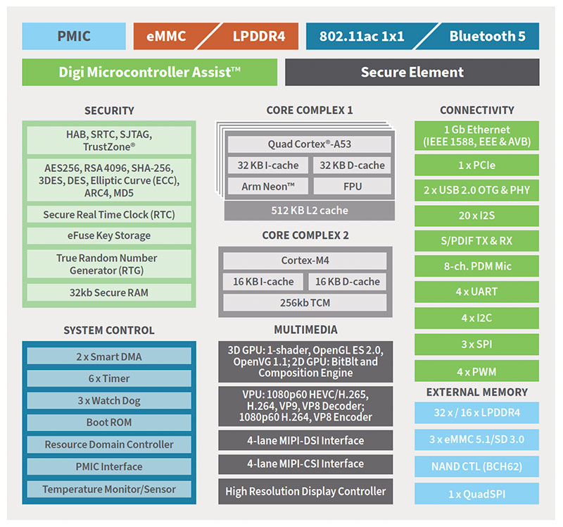 Digi ConnectCore 8M Miniは、電力効率に優れた4つのArm® Cortex®-A53コア、1つのCortex-M4コア、Digi Microcontroller Assist Cortex-M0を備えており、高水準のパフォーマンスを維持しながら電力消費を最小限に抑えることが可能です。OEMは、10年以上の製品ライフサイクルを実現する本製品の、認証取得(予定)されたワイヤレスコネクティビティ、リモートマネジメント、クラウドインテグレーション、統合開発環境のLinux Yocto ProjectとAndroidソフトウェアプラットフォームサポートを活用することで、開発コストとTCOの低減を実現できます。